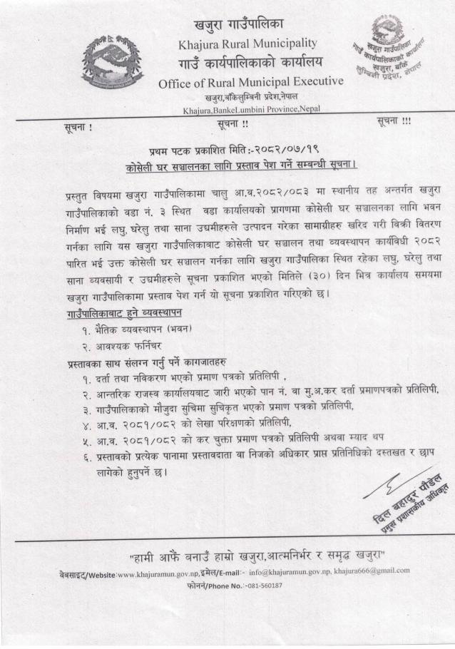 » कोसेली घर संचालनका लागि प्रस्ताव पेश गर्ने सम्बन्धी सूचना।। प्रथम पटक प्रकाशित मितिः२०८२/०७/१९