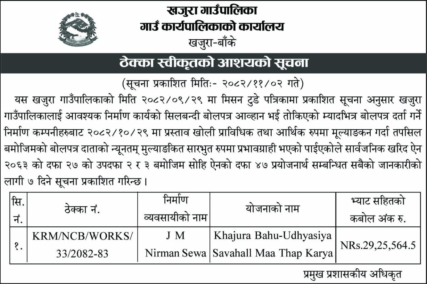 ठेक्का स्वीकृतको आश्यको सूचना ।। (प्रकाशित मितिः२०८२।११।०२)