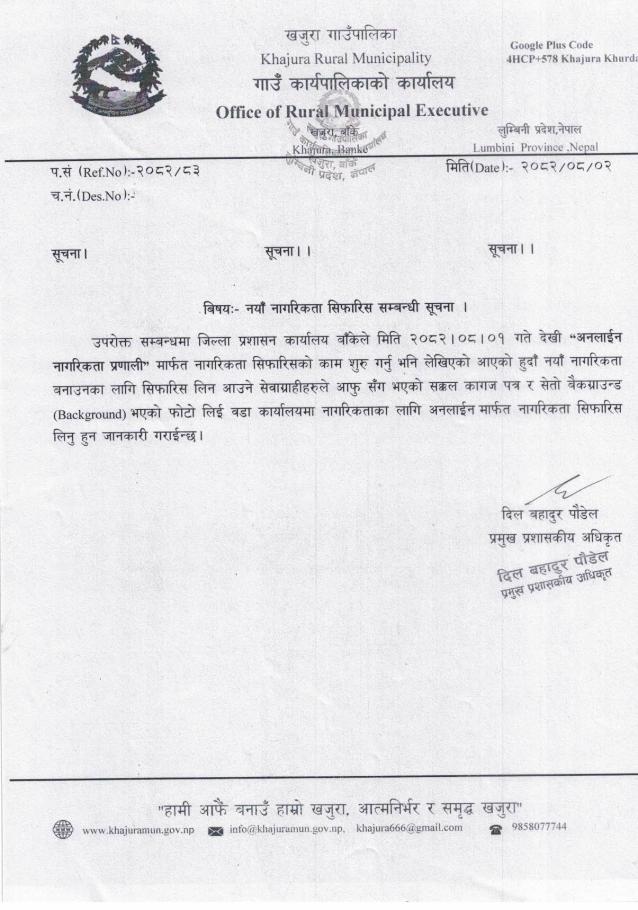 नयाँ नागरिकता सिफारिस सम्बन्धी सूचना।