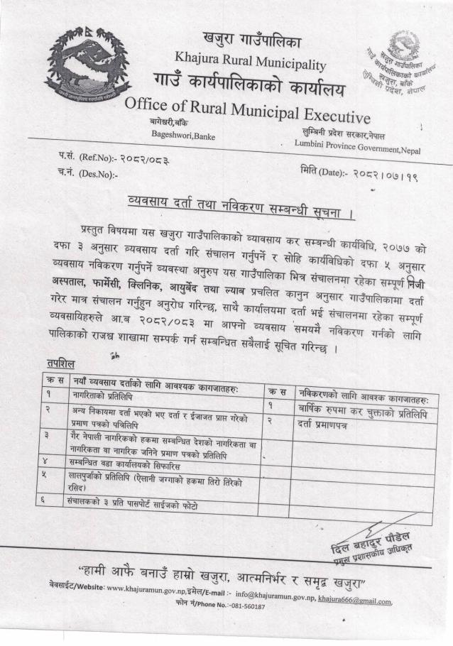 व्यवसाय दर्ता तथा नविकरण (निजी अस्पताल,फार्मेसी,क्लिनिक,आयुर्वेद तथा ल्याब) सम्बन्धी सूचना ।।