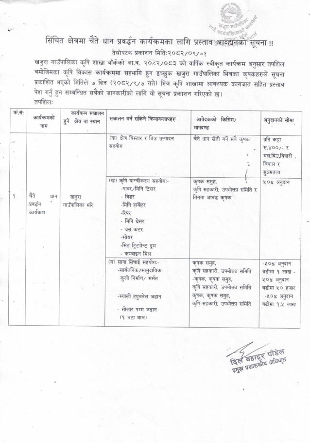 » सिंचित क्षेत्र चैते धान प्रवर्द्वन कार्यक्रम लागि प्रस्ताव आव्हानको सूचना ।। तेस्रो पटक प्रकाशित मितिः२०८२।९।१