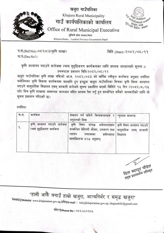 कृषि अध्यापन गराउने कलेजमा ल्याब सुदृढीकरण कार्यक्रमका लागि प्रस्ताव आव्हान सूचना ।।
