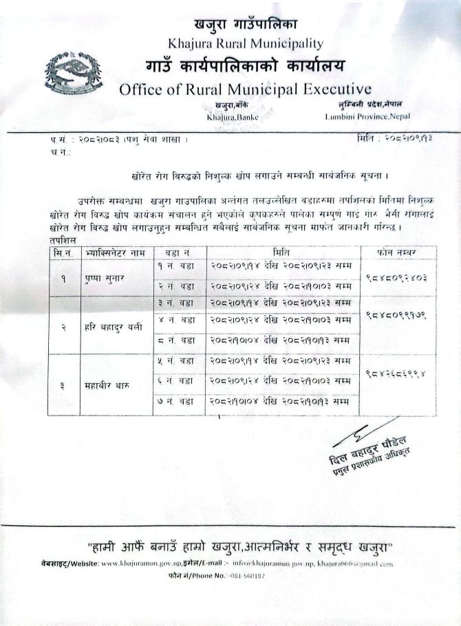 खोरेत रोग विरुद्वको निशुल्क खोप लगाउने सम्बन्धि सूचना ।।