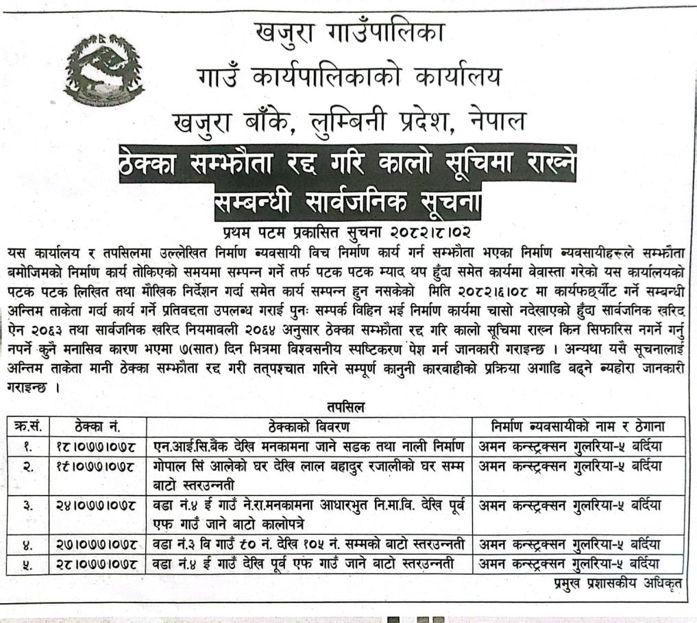 » ठेक्का सम्झौता रद्द गरि कालो सूचिमा राख्ने सम्बन्धी सूचना।।