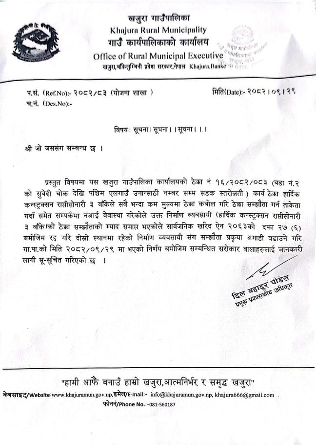 खजुरा गाउँपालिका वडा नं ३ बागमतीनगर केन्द्रम कार्यालय सरी सोहि स्थानबाट सेवा प्रवाह सम्बन्धी सूचना।।
