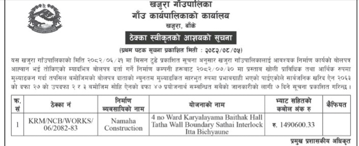 ठेक्का स्वकीकृतको आशयको सूचना ।।