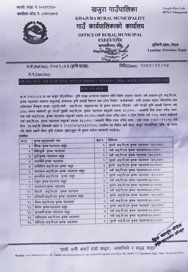 » नयाँ तथा पुरानो आइ.पि.एम कृषक पाठशाला समुहहरुले पालिकाको विविध खातामा लागत साझेदारि रकम जम्मा गर्ने सम्बन्धी सूचना।