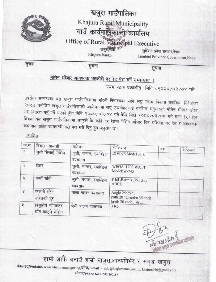 » मेशिन औजार आवश्यक भएकोले दर रेट पेश गर्ने सम्बन्धमा !!!