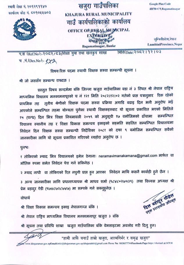 रिक्त पदमा स्थायी शिक्षक सरुवा सम्बन्धि सूचना ।।