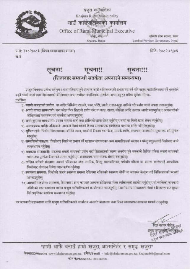» शितलहर सम्बन्धी सतर्कता अपनाइने सम्बन्धी सूचना ।।