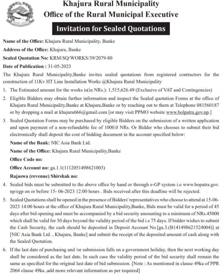 » हाई टेन्सन लाईन निर्माणका लागि शिलबन्दी बोलपत्र आव्हान सम्बन्धि सुचना !! (प्रथम पटक प्रकाशित मितिः २०८०।२।१७)