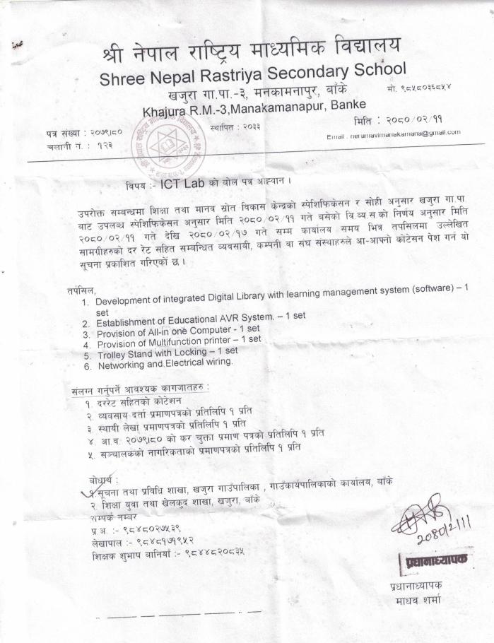 » ICT Lab सम्बन्धि शिल्बन्दी कोटेशन पेश गर्ने सम्बन्धी सूचना !!